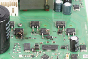 Ook kan het bij deze printplaat voorkomen dat de zes grote vermogens transistors (IGBT’s) defect raken (zie onderstaande afbeelding).